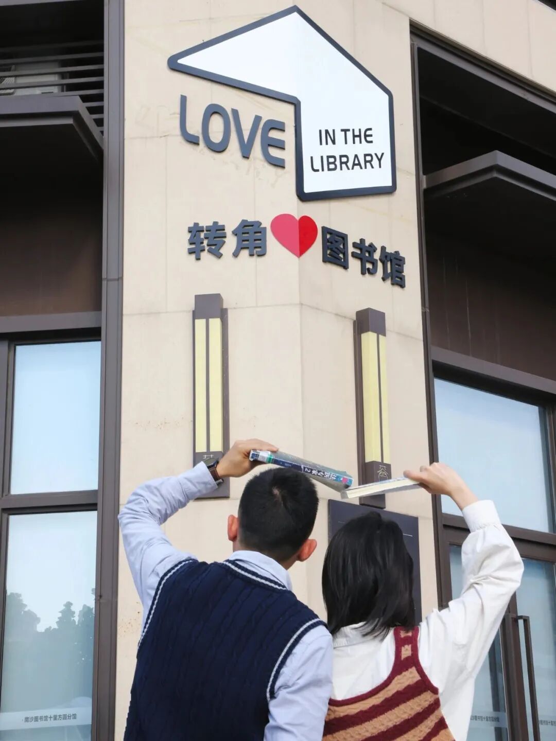 图书馆外的 “转角❤️图书馆” 标识超吸睛,和朋友一起,像图中那样手持书籍举在头顶,从背后拍摄,互动感拉满,轻松 get 青春又文艺的画面。