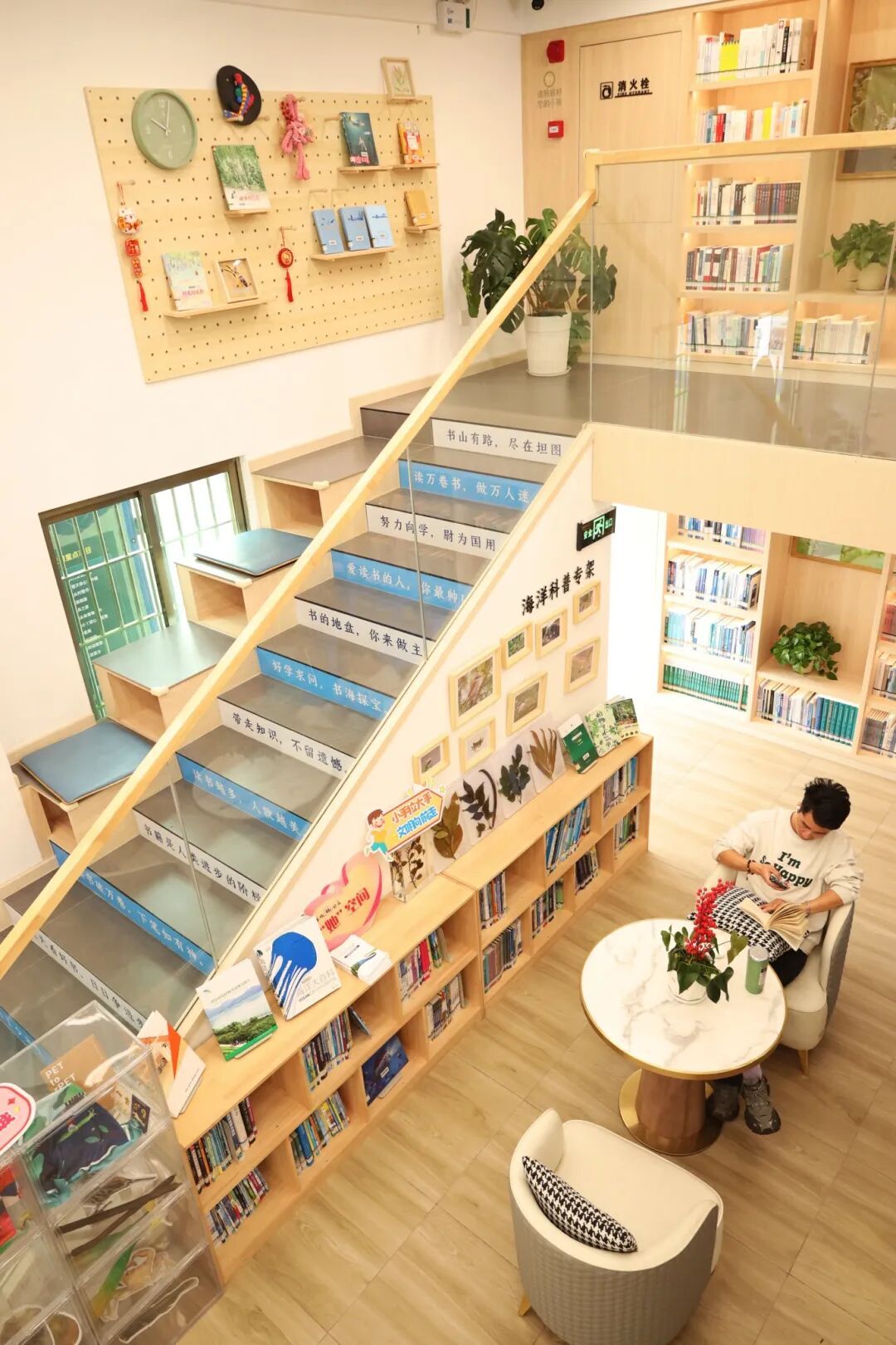 楼梯区域别错过,台阶有励志文字,旁有海洋科普展示,文艺又有知识氛围。站在楼梯上,抬头看书或侧身展楼梯墙面搭配,很出片。海洋科普专架处,动植物标本、图片是绝佳背景,站旁边如置身知识海洋,随手拍满是探索感~