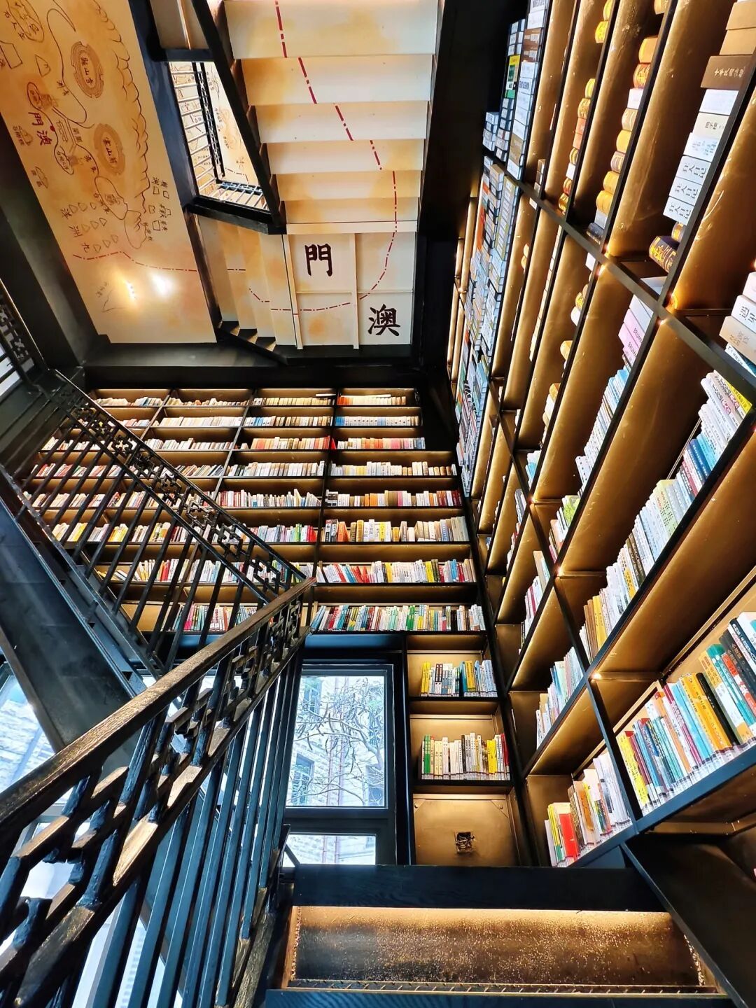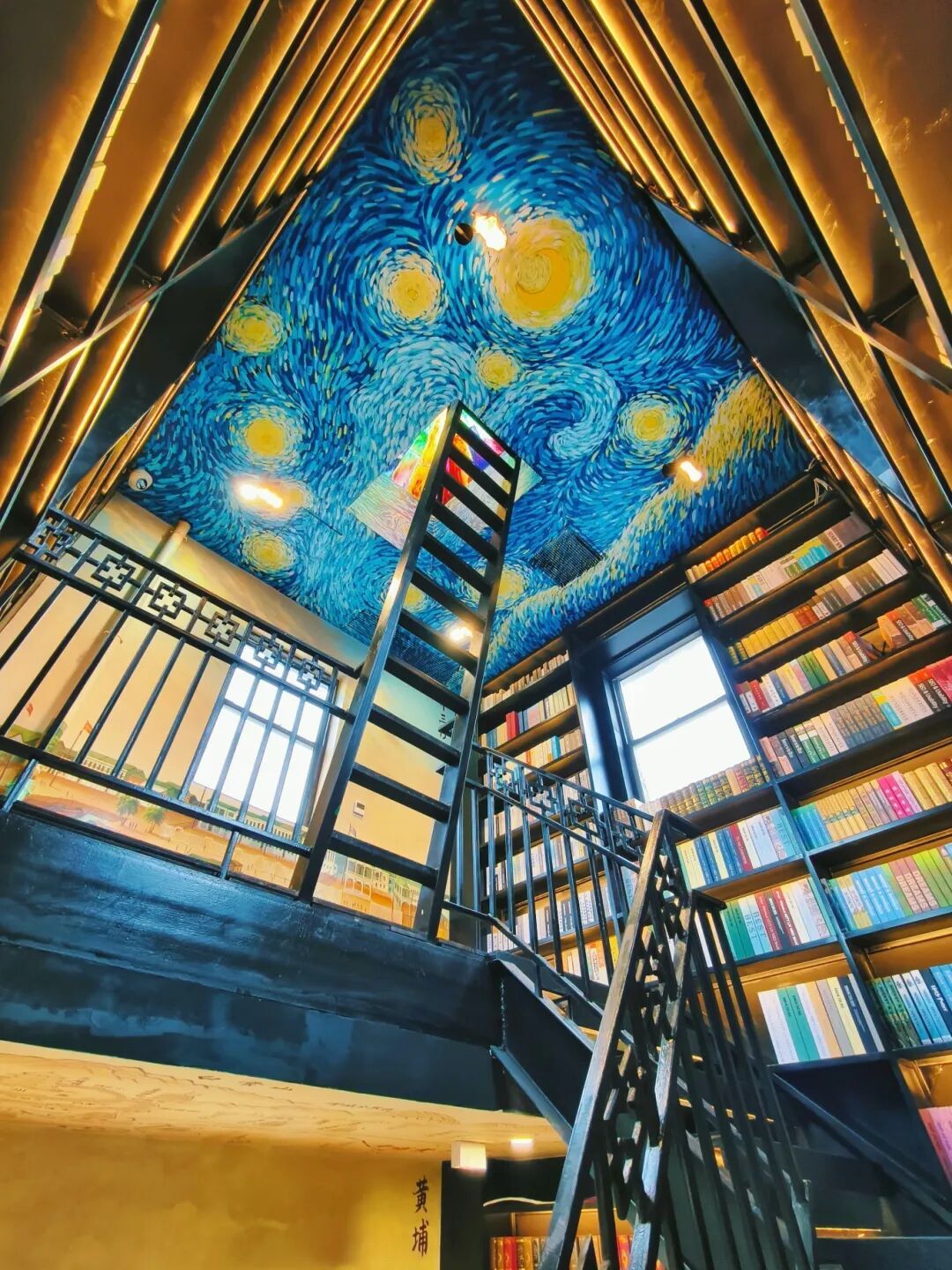 聚焦天花板,梵高《星月夜》风格的彩绘超吸睛,仰拍能完整捕捉梦幻星空,仿佛置身艺术之境。对准楼梯与书架,从下往上拍,让层层叠叠的书籍和错落的楼梯构成纵深感,瞬间打造“书海天梯”既视感。